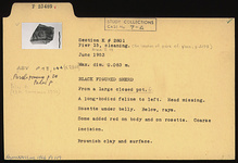 Description:   From a large closed pot. A long-bodied feline to left. Head missing. Rosette under belly. Below, rays. Some added red on body and on rosette. Coarse incision.