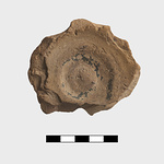 | Description: | Much of foot and some of adjacent body preserved. From a krater(?). Substantial flaring foot, conical beneath. Pinkish to buff clay, heavy fabric with bits; on the outside neatly surfaced with buff but on the floor heavy wheel marks remain. A few traces of black glaze on the floor; on the underside five irregular lines, roughly radiating from center to resting surface, retain a little glaze. | |