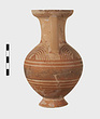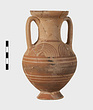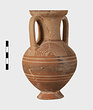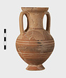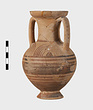 | Description: | Mended from many pieces; one handle and chips from rim, neck and base missing; restored in plaster. On either side, between handles, are two groups of concentric semicircles with triangular hearts. Bars on the handles. Rim and foot glazed. Pinkish-buff clay. Glaze unevenly fired, from black to light brown, and flaked. | |