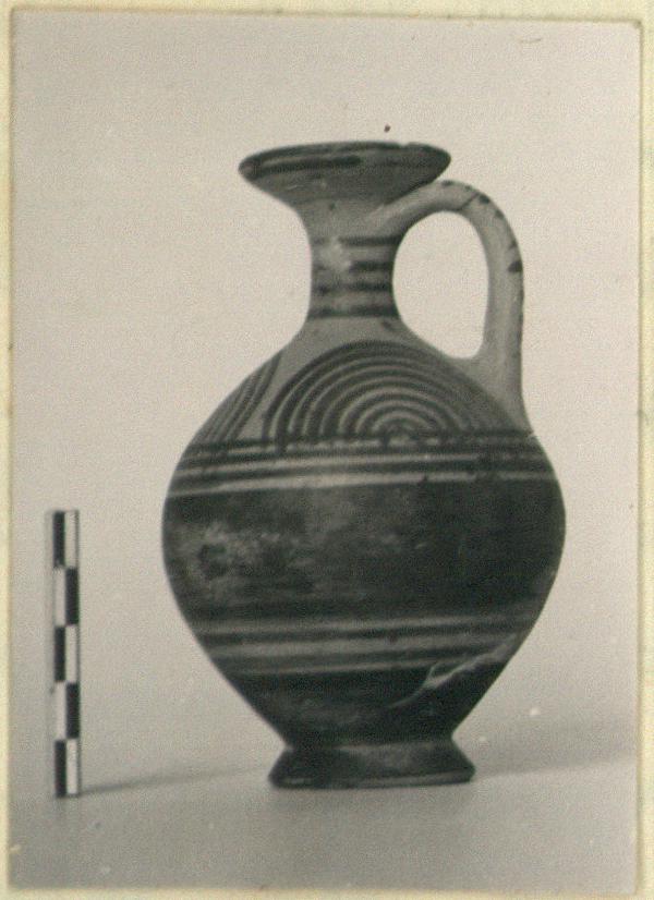| Description: | Broken in several pieces and two small bits missing; restored in plaster. On shoulder, three groups of concentric semicircles; on neck, four rings; rim glazed above; on handle, bars; on wall, two pairs of reserved lines; no ring at base of handles. Buff clay. Thin glaze fired blackish to light brown in places. Small round hole in shoulder to right of handle. | |