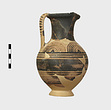 On shoulder, a panel of crosshatching is flanked to right and left by two groups of concentric semicircles filled with solid triangles. On wall, two groups of three reserved lines. On handle, crossbars. Ring at base.
