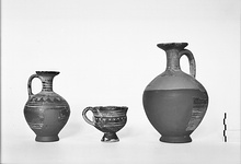 | Description: | Fragmentary; base missing; restored in plaster, but without base. On shoulder, sawtooth and zigzag line; on body, two groups of three reserved lines each; on neck, three rings and one zigzag line; on handle, crossbars. Buff clay. Firm red glaze. Small round hole at base of neck. | |