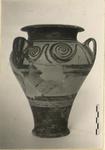 | Description: | Many fragments missing from wall and rim; restored. Broad downsloping rim; high shoulder; projecting ring foot; vertical band handles. On shoulder, between each pair of handles, a pair of spirals, one larger and one smaller, with connecting loops. The neck glazed inside and out, a reserved line on the rim. Bands on body below handles; lower wall glazed solid. Pinkish clay with light buff surfacing. Decoration in red-brown glaze paint, fairly firm. | |