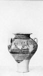 | Description: | Lower body and base, many wall fragments, part of the rim and two of the handles missing and restored. Flat rim; vertical band handles. Two linked spirals between each pair of handles; two groups of bands below; neck glazed inside and out; row of dots around reserved mid-part of rim; handles glazed outside. Greenish-yellow clay. Black to brown paint much flaked. | |