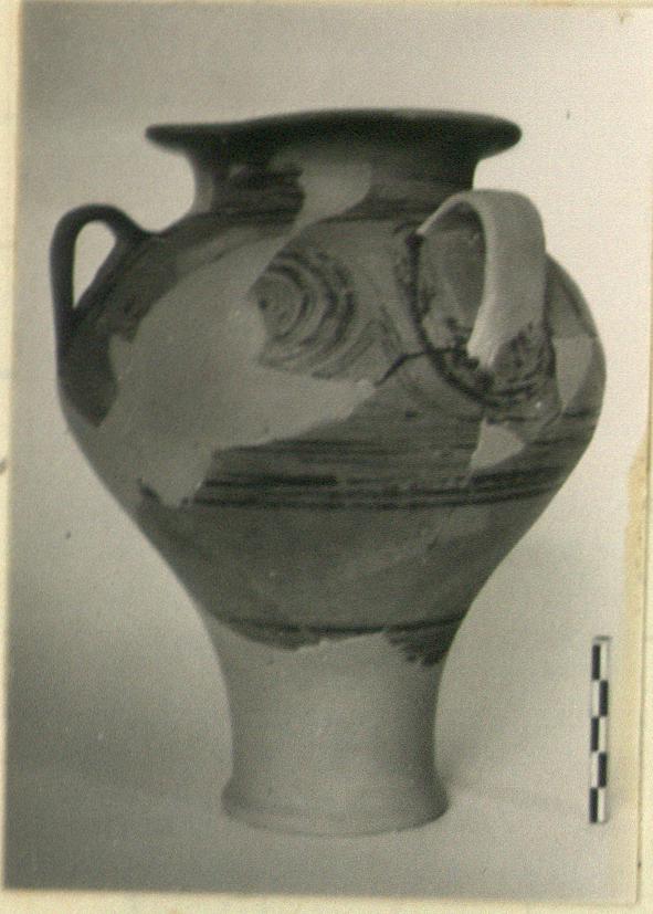 | Description: | Lower body and base, many wall fragments, part of the rim and two of the handles missing and restored. Flat rim; vertical band handles. Two linked spirals between each pair of handles; two groups of bands below; neck glazed inside and out; row of dots around reserved mid-part of rim; handles glazed outside. Greenish-yellow clay. Black to brown paint much flaked. | |