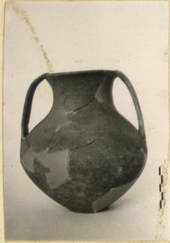 | Description: | Many wall fragments and part of rim missing and restored. Flat bottom; rounded body; lip out-turned; thin strap handles springing from lip. Coarse light brown clay surfaced with a thin red-brown slip or glaze wash. | |