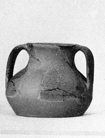 | Description: | Handle, most of mouth and part of upper wall remain; partly restored. Shape similar to P 23567, but the strap handles springing from the lip are thicker and slope downward less rapidly. Coarse light brown clay, surfaced with thin red-brown slip or glaze wash. | |