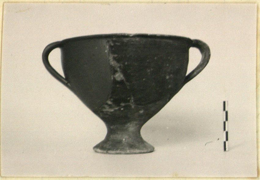 | Description: | One handle and much of one side missing; restored in plaster. Type and fabric similar to P 23571, but with a shorter thicker stem and smaller more flaring foot, concave beneath. Coarse buff clay. Thin dull chocolate-brown glaze paint overall except on underside of foot. ADDENDA Acropolis burnished ware, cf. Mountjoy (1981). | |