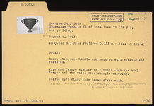 | Description: | Base, stem, one handle and much of wall missing and restored. Type and fabric similar to P 23571, but the bowl deeper and the walls more sharply tapering. Coarse buff clay. Thin brown glaze wash. ADDENDA Acropolis burnished ware, cf. Mountjoy (1981). | |