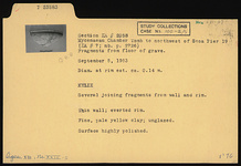 | Description: | Several joining fragments from wall and rim. Thin wall; everted rim. Fine, pale yellow clay. Unglazed. Surface highly polished. | |