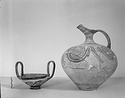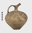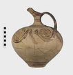 | Description: | Much broken but largely complete; small bits from base and wall restored. Broad piriform body on narrow flat bottom; trough spout; strap handle, ridged down the middle and with a bulge at the lower attachment; flat plastic ring at junction of neck and shoulder. Large spirals and groups of petals on shoulder; groups of bands on spout, neck and around lower wall; outside of handle glazed. Greenish-buff clay and surfacing. Black glaze much flaked. | |