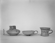 | Description: | Mended from several pieces; fragment from rim and bottom missing, restored in plaster. Mug with flat bottom, concave sides and single handle. Handle zone decorated with pattern like a retrograde N; above and below, lines. On the bottom, at the center, four concentric circles. Rim, edge of bottom and outside of handle glazed. Pinkish-buff clay. Light red glaze. | |