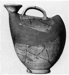 | Description: | Mended from countless fragments. Most of rim and sides missing, the handle on the upper surface beside the spout is preserved. The shape resembles that of the early "duck" vases of the Cycladic period. Ring base. Greenish clay, unglazed, with red core. | |