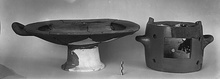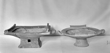 | Description: | Almost the entire circuit of the vase preserved, mended from many fragments. High, hollow foot, shallow flaring sides, rim triangular in section, one handle preserved. Coarse buff gritty clay. Traces of coals in inside. Cf. Agora XII, no. 2030. (Four fragments of brazier of the smaller, deeper type preserved in box.) | |