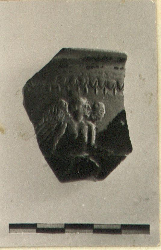 | Description: | Small rim fragment. On wall, Eros, standing facing, with head to right, holds a long spear(?) horizontally, of which neither end is preserved. In upper zone, a band of ovules with darts below. Pinkish-buff clay. Black glaze, of which upper half has peeled off. | |