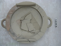| Description: | Almost the entire circuit of the vase preserved, mended from many fragments. High, hollow foot, shallow flaring sides, rim triangular in section, one handle preserved. Coarse buff gritty clay. Traces of coals in inside. Cf. Agora XII, no. 2030. (Four fragments of brazier of the smaller, deeper type preserved in box.) | |