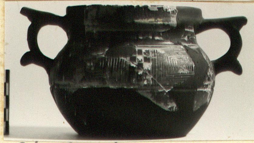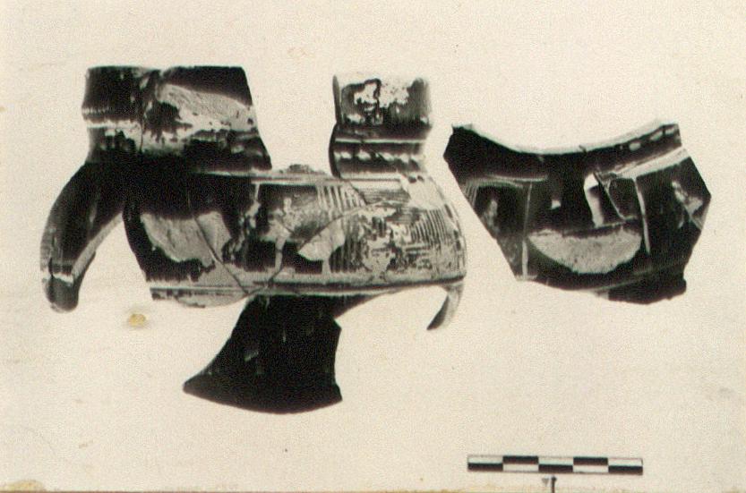| Description: | Many joining fragments make up into two non-joining from upper part of kantharos. Both handles missing. Restored in plaster. Wide mouth; plain nearly vertical rim; short concave neck; plump body. Around neck, between two grooves, a single line of leaves and berries in added clay and white. Around shoulder, between grooves, diminishing rectangles and checkerboard; in panels beside handles, tree or flower. Pinkish-buff clay. Glaze black, much flaked. Sherds from same fill in Box 227. | |