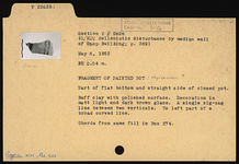 | Description: | Part of flat bottom and straight side of closed pot. Decoration in matte light and dark brown glaze. A single zigzag line between two verticals. To left, part of a broad curved line. Buff clay with polished surface. Mycenaean? Sherds from same fill in Box 274. | |