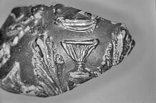| Description: | Two non-joining fragments from same bowl. a) from near bottom: large fronds separated by kantharoi; above, Erotes standing in boat with an Eros in field between each boat. b) small fragment with tip of one frond and one kantharos, one boat and one figure. Metallic black glaze. | |