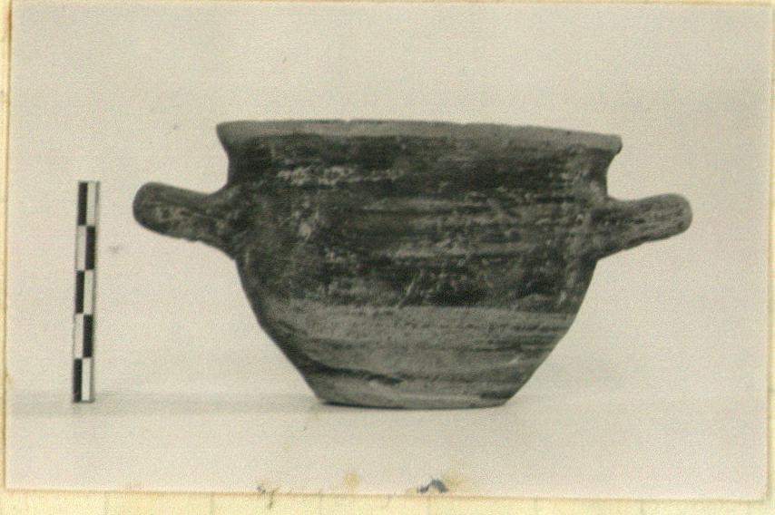 | Description: | Intact. Small deep cup with horizontal handles and flat bottom. Rim reserved; on the inside, two narrow bands, and groups of crosshatching. Reserved band around middle of wall inside. Streaky black to brown glaze. | |