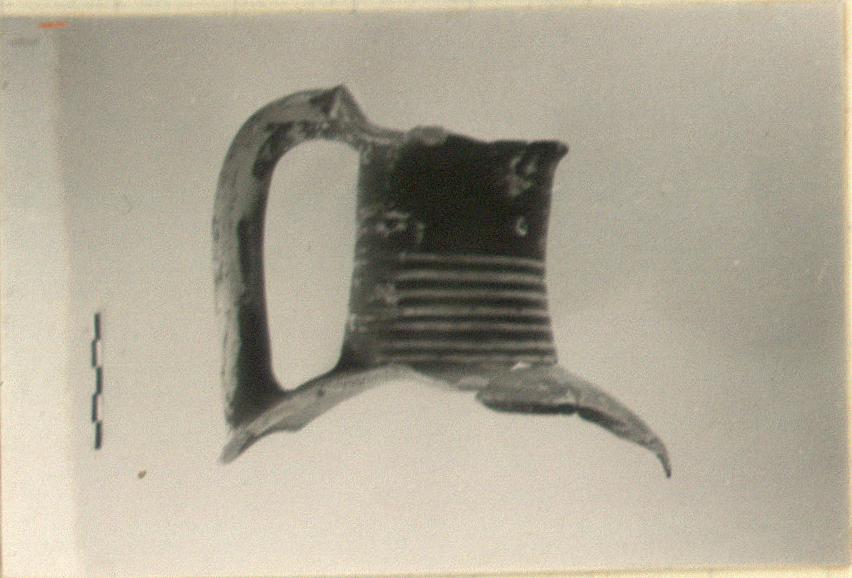 | Description: | Neck preserved, with the rim at the back only; heavy rolled handle from the rim, and a little of the rounded shoulder also preserved. Glazed all over so far as preserved, mottled red to black. Around the lower part of the neck, seven white bands; on shoulder, at center a motif consisting of two zigzag lines(?) in white; below this, a white line around the shoulder. | |