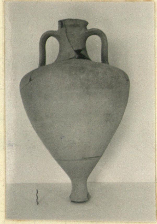 | Description: | The lower part preserved in one piece; the upper part mended; fragments missing from lip and shoulder. Rim with angular profile; neat flaring button toe. On the shoulder, a single letter painted in red: <graphic> A band of reddish glaze around the lower wall, and another at the edge of the foot. Gritty light brown clay. Unglazed. Interior thickly coated with pitch. | |