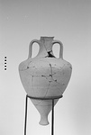 | Description: | The lower part preserved in one piece; the upper part mended; fragments missing from lip and shoulder. Rim with angular profile; neat flaring button toe. On the shoulder, a single letter painted in red: <graphic> A band of reddish glaze around the lower wall, and another at the edge of the foot. Gritty light brown clay. Unglazed. Interior thickly coated with pitch. | |