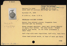 Description:   Mended from several pieces; fragments from shoulder and lip missing. Broad rounded shoulder; lower wall slopes sharply to small flat bottom. Cut away mouth. Ridged handle from mouth; at its lower attachment a small boss. Glaze band around mouth, at base of neck and above bottom; two stripes down the handle, and three bands around point of greatest circumference. On shoulder, running spirals connected by wave pattern.
