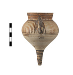 | Description: | Mended from several pieces; small chips missing. Plump pear-shaped funnel with plain rim, slightly flaring; slender tapering funnel-end. Vertical rolled handle on shoulder. Decoration in brown to red-brown glaze. The rim glazed outside, and for a short distance inside; the handle and the funnel-end glazed. On the shoulder, a broad zone of verticals; on the lower wall groups of narrow bands. Light buff clay. | |