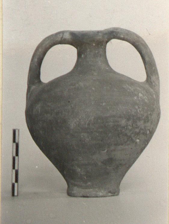 | Description: | Spout missing, and chips; one handle broken off and mended. Small broad-shouldered amphora, the walls tapering to a small false ring foot; narrow neck, flaring to plain rim, on one side apparently drawn out to form a spout, now missing. Rolled handles, rim to shoulder. Pinkish-buff clay with many impurities, outside, and inside to bottom of neck covered with thin dull reddish-brown glaze wash, considerably worn. | |