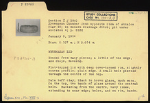 | Description: | Mended from many pieces; a little of the edge, and chips, missing. Flat-topped lid with deep downturned rim, slightly convex profile; plain edge. A small hole pierced through the center of the top. On the top, two bands of glaze around the central hole. Radiating from the center, wavy lines extending to near edge; below and on rim, bands. Pale buff clay; black to brown glaze, much worn. | |
