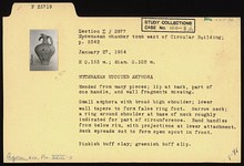 | Description: | Mended from many pieces; lip at back, part of one handle, and wall fragments missing. Small amphora with broad high shoulder; lower wall tapers to form false ring foot. Narrow neck; a ring around shoulder at base of neck roughly indicated for part of circumference. Band handles from below rim, with projections at lower attachment. Neck spreads out to form open spout in front. Pinkish-buff clay; greenish-buff slip. | |