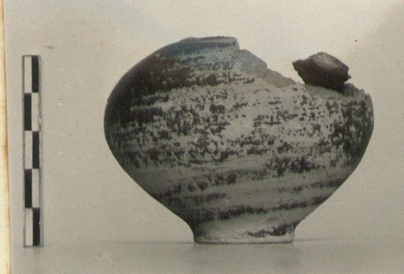 | Description: | Upper part entirely missing, and much of wall. Small plump pot on very small ring foot. Trace of start of neck, at broken upper edge of shoulder. No remains of handles. Very heavy fabric, gray to lavender; the outer surface a thick layer of buff-pinkish (slip?). Thin but lustrous brown to red-brown glaze over all, worn. | |