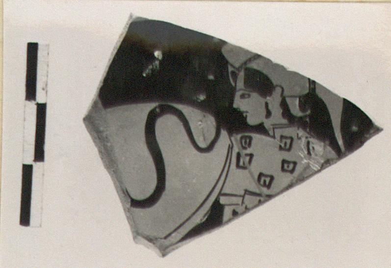 | Description: | Fragment of floor with some of foot, a very low small ring with bevelled sides. Head and torso of warrior, left, seen from behind, and part of the shield, held on the extended left arm. Ornamented corselet. Traces of red in the field, probably once letters. A red cord hangs over the shoulder, to his waist. Relief contour. Underside reserved and neatly circled. | |