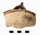 | Description: | Three joining fragments preserve handle and some of rim and body. Wishbone handle. Deep cup with slightly everted rim; handle rises above rim. Rim glazed inside and out; handle glazed. In the handle zone, running spirals with tails. Pinkish-buff clay; buff slip. Decoration in red to brown glaze. | |