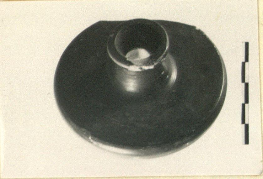 | Description: | Chip missing from side. Lid for a small lekanis (or a pyxis). Plain lid with flange below and high hollow knob above. Glazed all over; black below, brownish above. | |