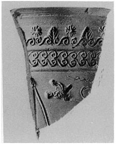 | Description: | Rim fragment. Everted lip. Main zone: part of long petal and a bird preserved. Rim decoration: band of simplified guilloche with running spirals crowned by alternating palmettes and star rosettes. Fine pinkish-buff clay. Very crisp and neat. For the star rosette cf. P 23768, somewhat similar. | |
