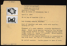 | Description: | Part of shoulder and neck, with both handles; nothing of rim preserved. Fragment of a neck amphora, probably Panathenaic shape. Short thick handles springing from moulded ridge around middle of neck. Tongue pattern below ridge; above it, laurel(?) wreath. Below handles, double palmettes with volutes. A little of the figured decoration is preserved on one side only; the top of a wreathed head, left. No relief contour. Inside glazed to base of neck. | |
