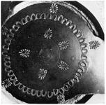 | Description: | Most of the circle of the foot preserved, with the floor, a little of the wall and rim, and one handle stub; two non-joining fragments give a little more of the rim and another handle stub. Foot has very slight lower moulding. Offset of rim inside also very slight. Scraped groove around wall outside, just above junction with foot. On the floor, five palmettes fairly widely spaced around the center, then a band of ovules, with five palmettes set on it, spaced around. Glaze good inside; outside much mottled. Outside light: a broad glaze band near the outer circumference; two thin circles and dot at center. | |
