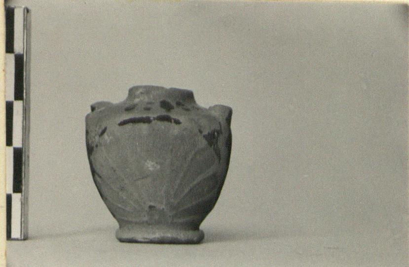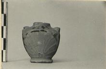 | Description: | Both handles missing. Raised base, left rough. On shoulder, tongues; on front, woman's head in kerchief, left; on back, large palmette. Poor thin glaze, so badly worn that decoration is only just discernable. | |