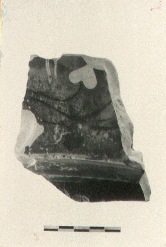| Description: | Rim fragment. Heavy vertical rim with ivy wreath, the leaves reserved, the tendrils and berries painted in (faded) white. Glaze mottled black to red. | |