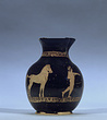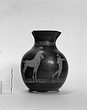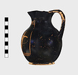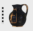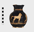 | Description: | Part of lip and chips from foot missing; otherwise intact. Trefoil lip. A boy, nude, walking right, leading a horse by a long rein which hangs over his bent left arm; in his outstretched right hand he carries a large wreath and a bunch of small branches. Fillet in added clay; rein, wreath and branches in white. Egg and dot border above and below panel; reserved line at sides. Glaze somewhat grayed and worn. No relief contour. | |