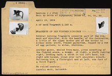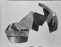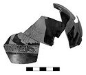 | Description: | Several joining fragments preserve part of the rim, neck and shoulder, with the handle. Of the decoration, a little of the upper border and of the border to either side remains: above, framed palmettes, topped by a row of egg pattern; to sides, chevrons. Another piece, mended from many, gives something of the figured scene, a komos. At right, a youth running right, looking back; a torch in his left hand, his right arm raised; cloak over left shoulder; wreath. Following him, a flute-girl, and at left, one foot of third figure. Another small fragment, gives part of drapery and thigh of left figure. No relief contour. Careful work, battered. | |