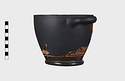 Dull glaze, somewhat worn, especially on handle. Resting surface and space inside reserved; three circles and dot at center.