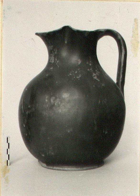 | Description: | Small chips from lip and base missing. Ring foot; trefoil mouth. Glaze fired red. | |