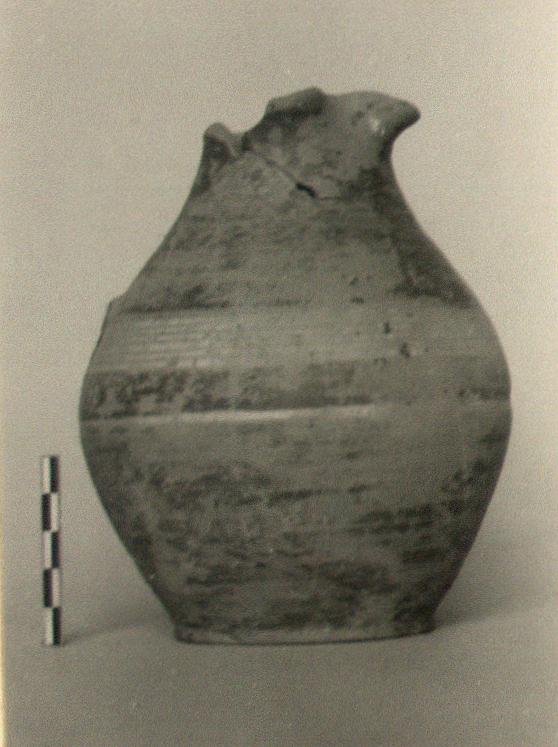 | Description: | Handle, fragments of body and rim missing. Greatest diameter half way down. Six reserved bands above, one below greatest diameter. Disk foot. Trefoil mouth. Pinkish-buff clay with many bits; red glaze. | |