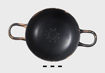 | Description: | Complete except for chips; mended from three pieces. Band of ovules surrounded by palmettes on floor. Good black glaze, a little worn. Bottom reserved, with glazed circle near center, through which are scratched several concentric circles. | |