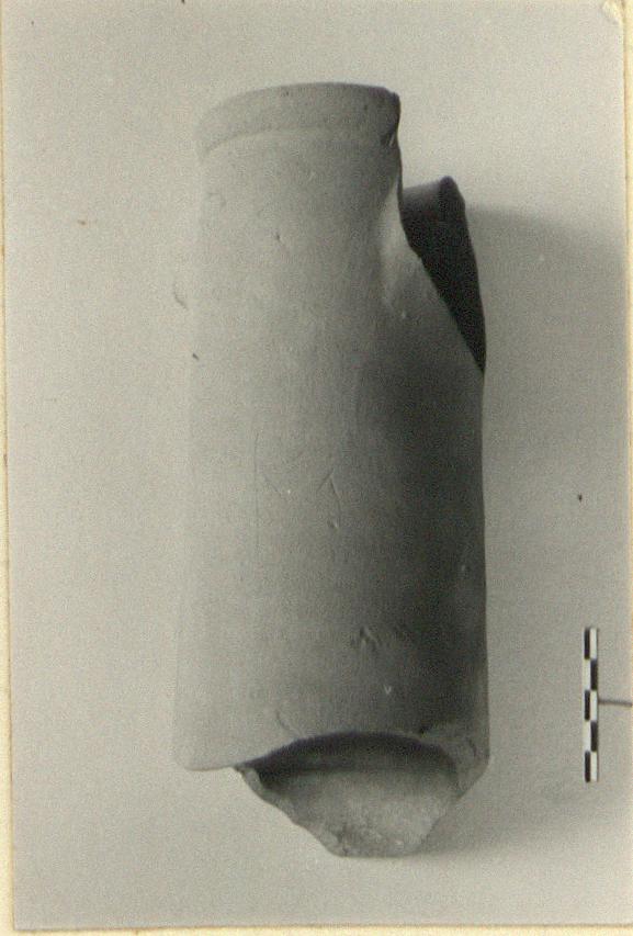 | Description: | Tall neck fragment with most of lip. Rolled rim. Two letters scratched on side of neck, kappa, lambda: <graphic> Light brown to red, slightly micaceous, clay. | |