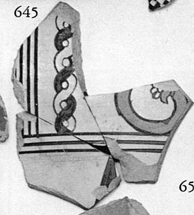 | Description: | Fragment from the wall of a vase, its inside unglazed. The panel is bound below by three narrow lines, to the left by at least four similar lines. On the left side of the panel is a vertical band of cable pattern, father to the right a tendril with a bud at its end. Beneath the panel is the tip of a base ray. Fine pinkish-buff clay fired yellow on the surface both inside and outside. The glaze is a cinnamon brown. The tendril and bud are outlined in this glaze but filled in with a pinkish-buff paint; the petals of the bud, and one half of the cable pattern are in outline only; the other half of the cable, and the ray, are solid. Protoargive? | |
