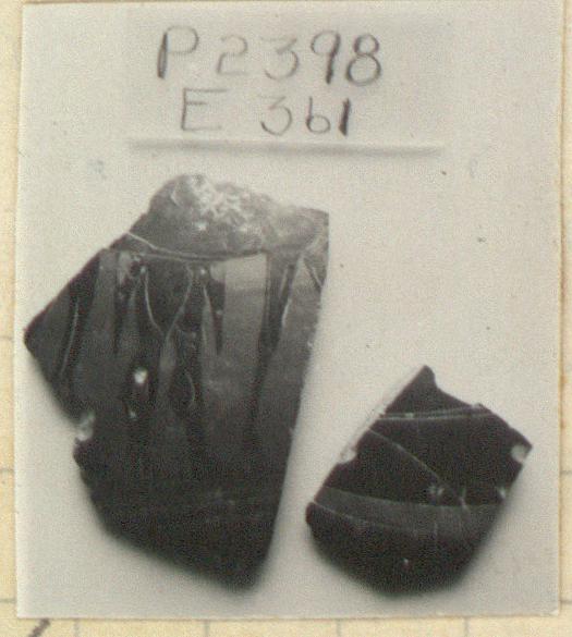 | Description: | P 2398b joins P 6078. Two small fragments from the sides. a) Represents the lower part of a man wearing a short chiton seen from below the belly and legs of a horse, parts of all four of which are preserved. b) Shows parts of horses. Unglazed inside; excellent black glaze on exterior. Red for panels of the chiton of the man and a band on the drapery. The red is bordered by a pattern of triple white dots. Two narrow red lines below the scene. | |